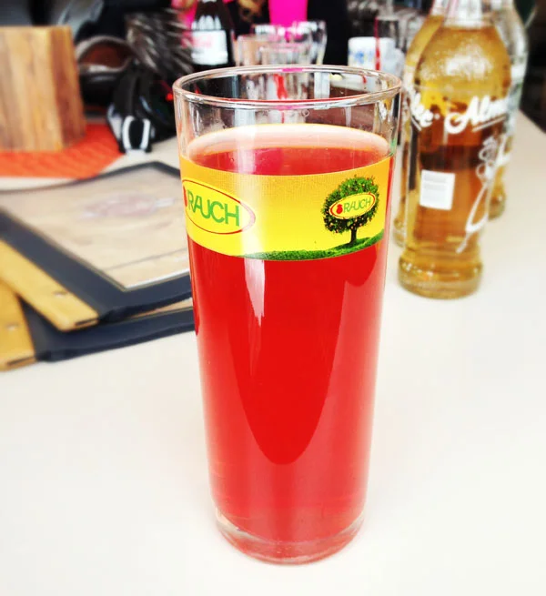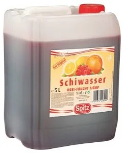 Also was ist nun dieses dubiose Schiwasser? Schiwasser besteht aus Wasser und Himbeersirup - künstlichem Himbeersirup. Manchmal wird auch 3-Frucht-Sirup (Himbeer-Zitrone-Orange) verwendet. Das erkennt man an der künstlichen pink-orangen Farbe, die auch unten auf dem Bild zu sehen ist.